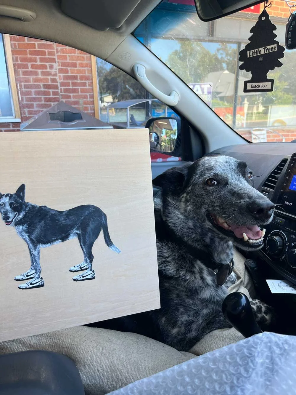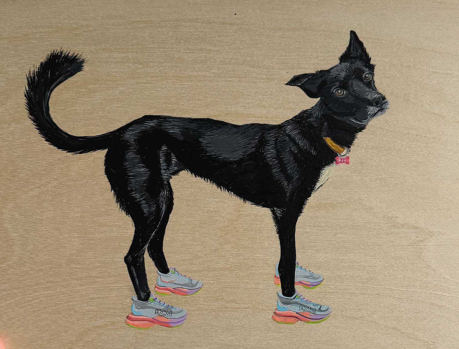 It all started with a surprise pet painting for a friend. I wanted to personalise it even more and thought her dog would look incredible wearing her Hokas…